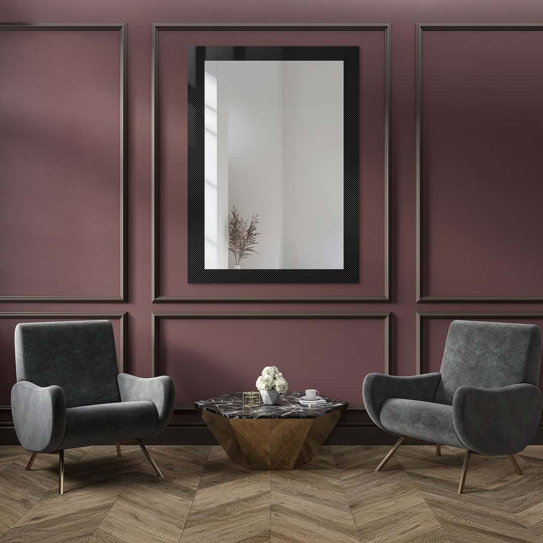 Ako izrađujemo pravokutni okvir ili kvadratni panel, vrijedi odabrati ogledalo istog oblika. Riječ je o kompoziciji u kojoj ogledalo u štukaturi ispunjava cijeli prostor unutar panela, koji mu postaje više ili manje dekorativan okvir. Jednostavan i moderan ili bogat sa ukrasnim profilima. Tada se može odabrati ploha bez okvira ili s LED pozadinskim osvjetljenjem ili se može iskoristiti LED štukatura. Svjetlo, bilo uz ogledalo ili uz letvice, naglasit će njihov uzorak i sjaj zrcalne plohe.