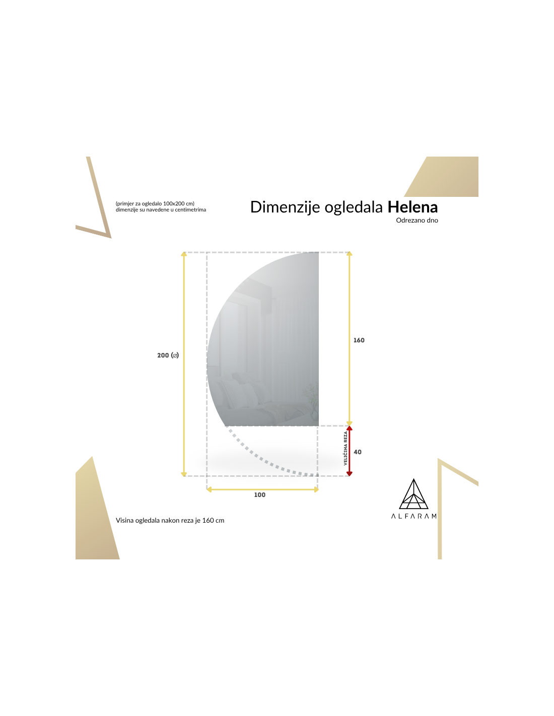Ukoliko niste pronašli željenu veličinu ogledala ili Vam je potrebna drugačija podjela, kontaktirajte nas telefonom ili e-mailom. Najveća ogledala koja možemo izraditi su 200x300 cm i okrugla ogledala promjera 200 cm. Ogledala izrađujemo po individualnoj narudžbi. Molimo pošaljite svoj upit zajedno s projektom na e-mail ogledala@alfaram.hr