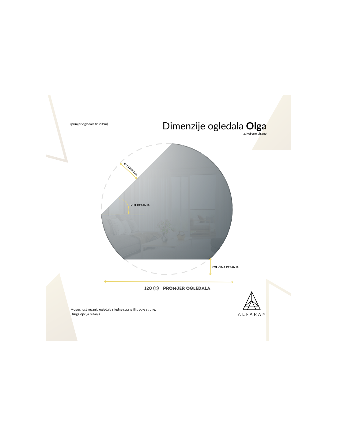 Ukoliko niste pronašli željenu veličinu ogledala ili Vam je potrebna drugačija podjela, kontaktirajte nas telefonom ili e-mailom. Najveća ogledala koja možemo izraditi su 200x300 cm i okrugla ogledala promjera 200 cm. Ogledala izrađujemo po individualnoj narudžbi. Molimo pošaljite svoj upit zajedno s projektom na e-mail ogledala@alfaram.hr