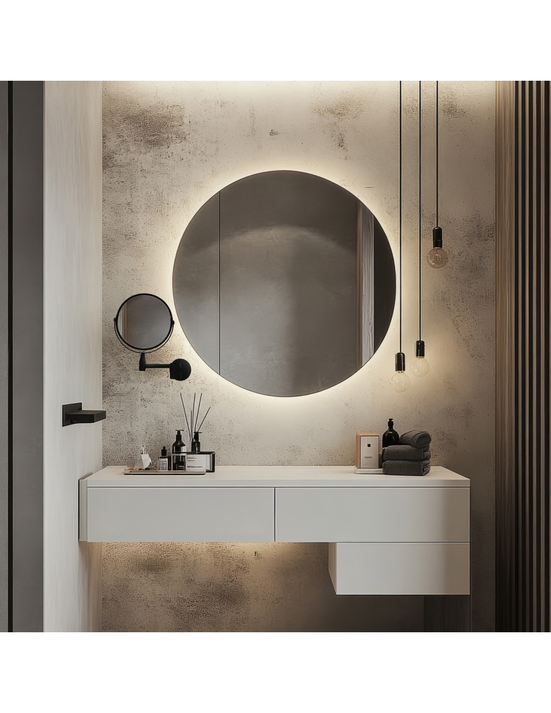 Standardna rasvjeta stvara aureolu oko ogledala. U slučaju odabira LED kućišta, svjetlo je smješteno u posebno kućište, što znači da ne stvara efekt aureole oko površine ogledala. Pri odabiru rasvjete za svakodnevno šminkanje nije moguće odabrati dodatak iz ove kategorije.